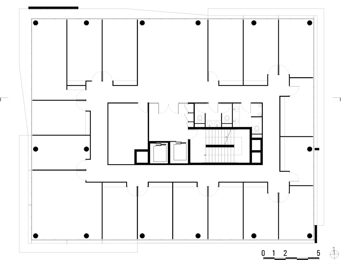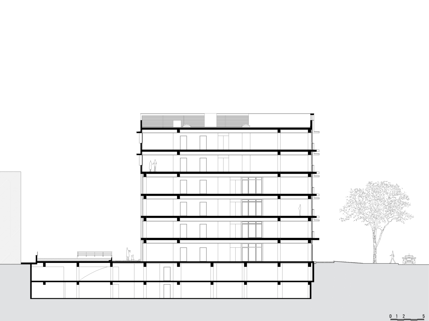 L’écriture traite clairement l’angle des voies par un décollement de « peau » où se glissent les auvents brise-soleil. Un vocabulaire contemporain où le jeu de lames blanches s’enroule autour des masses sombres des vitrages. Un jeu de mouvements qui cherche la légèreté pour ce plot compact posé sur un étroit foncier.
