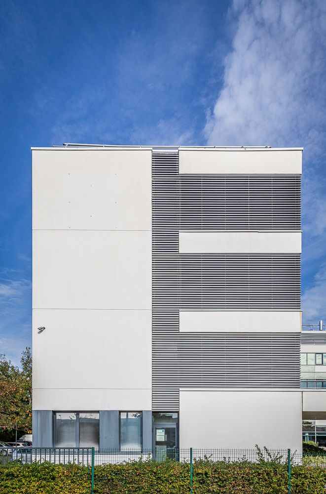 Les façades sont en harmonie avec le contexte environnant et affirment la continuité du quartier. Le socle est traité par un soubassement marqué et par une bande de percement horizontal qui provoque un jeu de décollement du volume. Au Sud, le portique d’entrée est un élément de transition entre l’espace publique de la rue et le hall d’accueil de l’établissement. Les niveaux supérieurs sont associés par un même traitement de percement composé d’un jeu régulier de baies verticales décalées d’un niveau à l’autre et amorti en bout de façade.