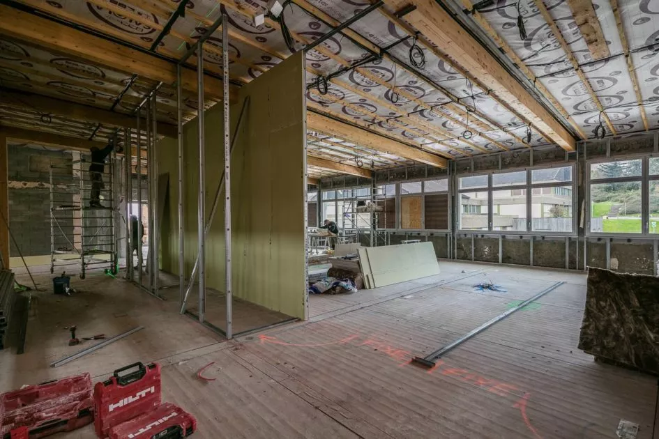 La construction comporte deux niveaux et accueille l’espace de restauration. Le plan permet une circulation efficace depuis le self jusqu’à l’espace de lavage. Un atrium redessine le volume intérieur de la salle de restauration.